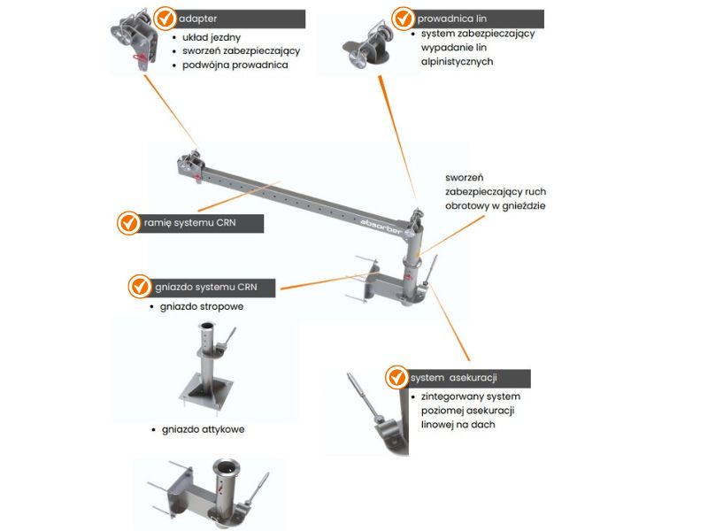 System zapewnia stabilne i bezpieczne stanowisko pracy na wysokości, a gniazda CRN mogą być połączone z systemem asekuracji linowej ROLER dla pełnej ochrony.