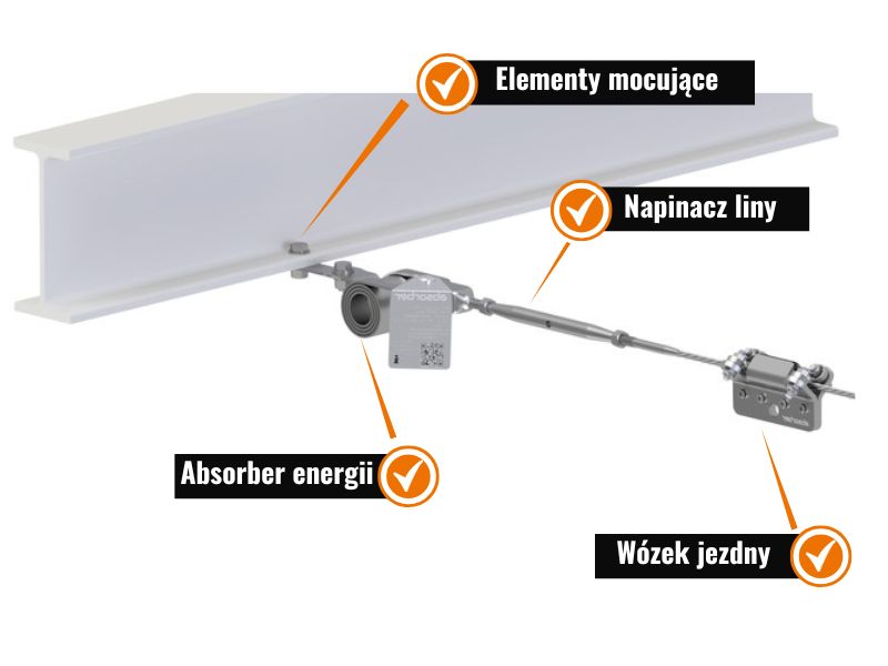 Możliwość połączenia gniazd z systemem asekuracji linowej tworzy kompleksowe rozwiązanie ochrony na wysokości.